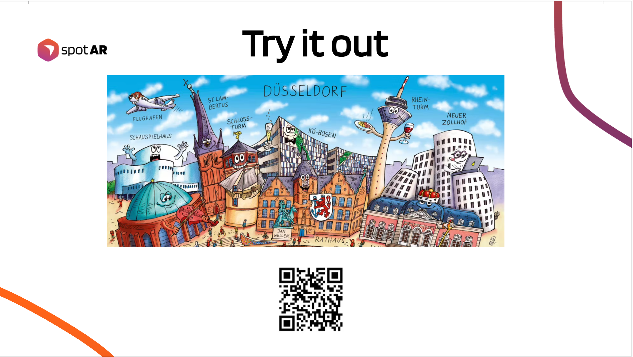 Central to the Düsseldorf City Quest's appeal is its creative partnership with Jacques Tilly, the artist renowned for his carnival floats and satirical designs. His involvement gave the campaign a visual identity rooted in Düsseldorf’s cultural character. Together with the spotAR team, he developed a 3D avatar based on the Rheinturm, the city’s iconic TV tower, which serves as a virtual guide throughout the experience. The avatar welcomes visitors, explains the game mechanics and invites them to explore the city through riddles and interactive challenges.