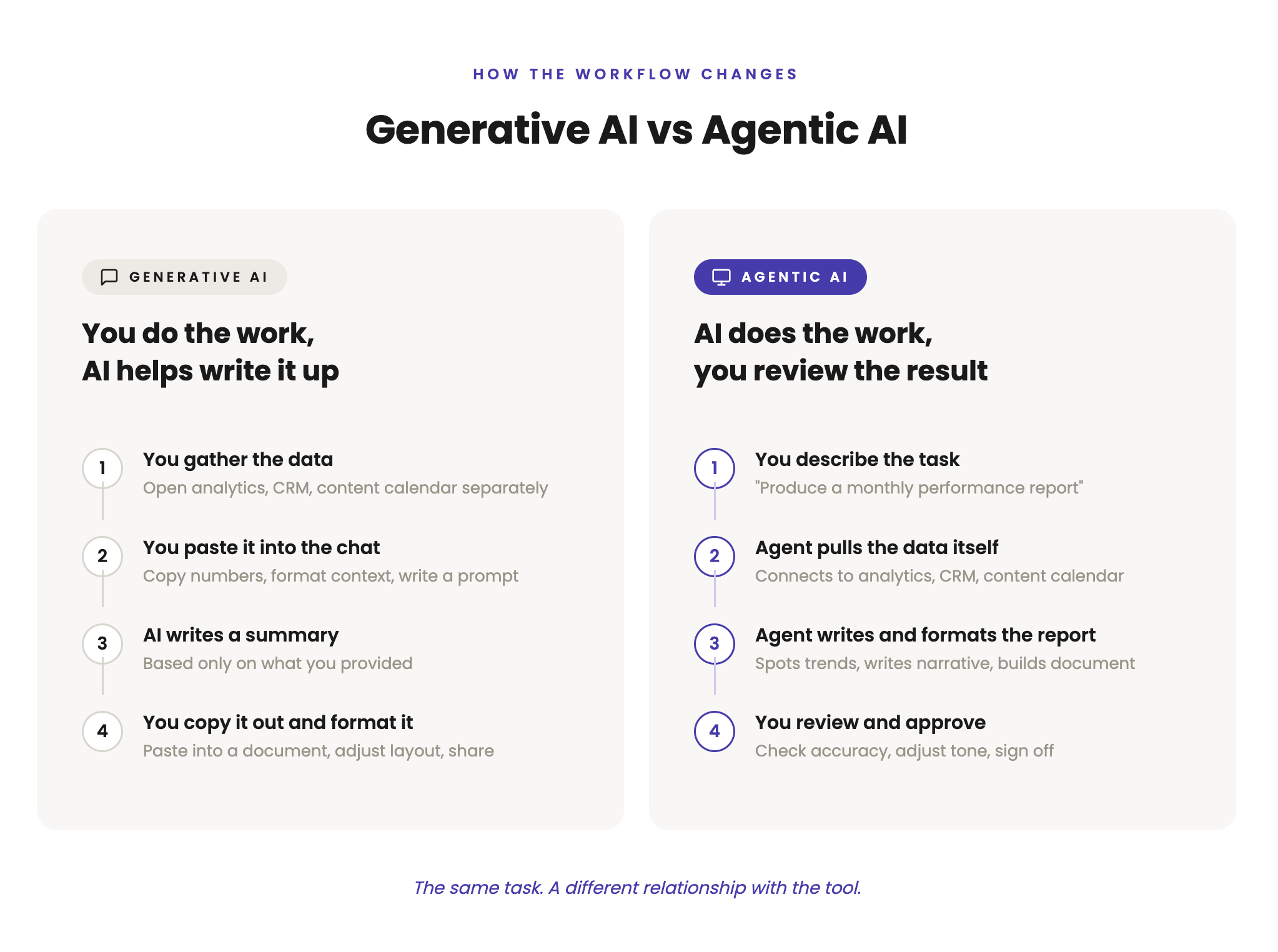 In the context of delivering monthly performance reporting, for example, traditional generative AI tools would require teams to gather the data themselves before getting a written summary. With an AI agent, teams can instead point it to their analytics dashboards, their CRM and content calendar to directly gather the necessary data to synthesise into a formatted document ready for review. By shifting the burden of repetitive execution to AI, the use of agents enables teams to delegate tasks and only focus on providing expert refinement. This allows DMO teams to dedicate their time to more complex and high-priority strategic initiatives.