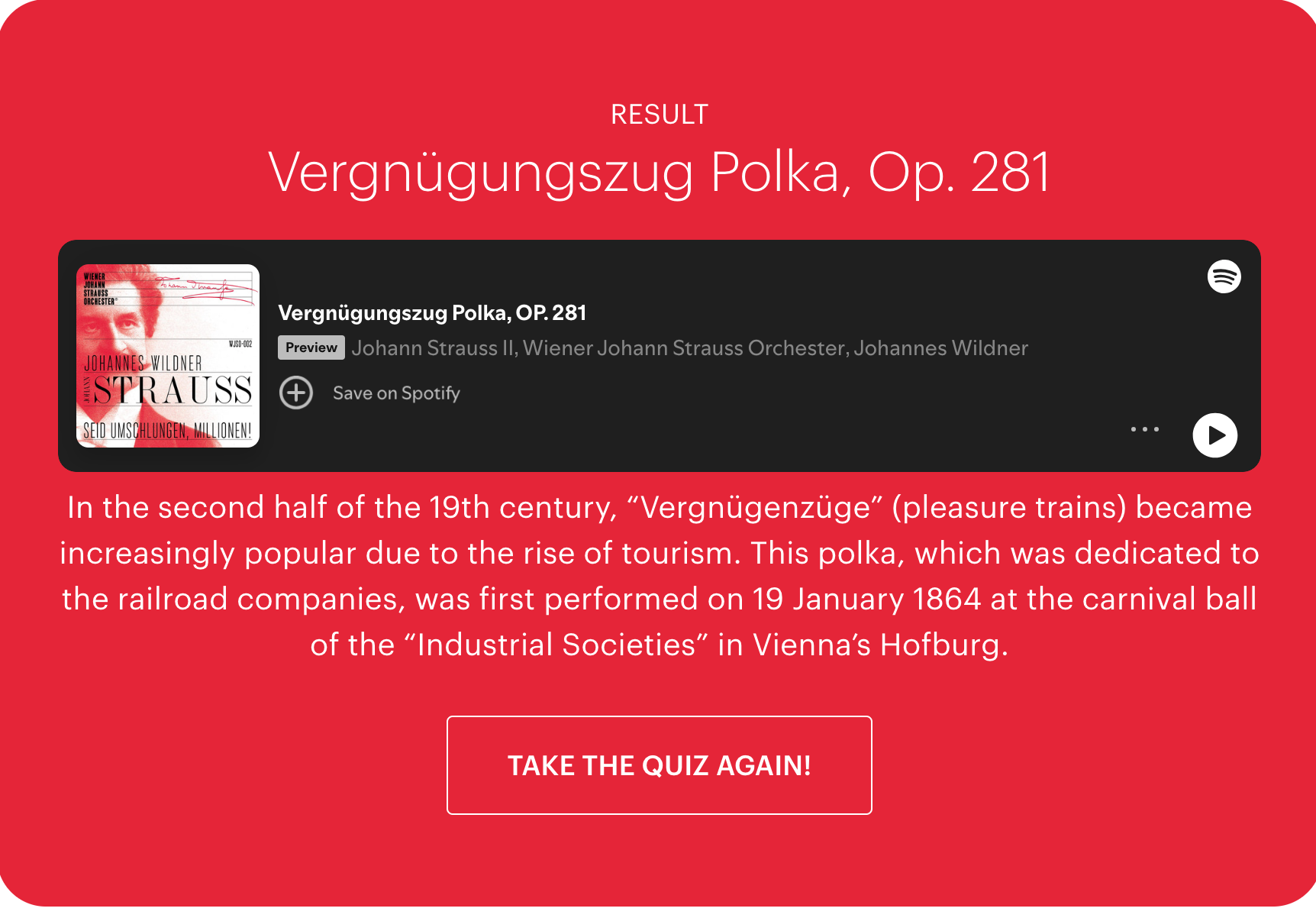 This cultural exploration was extended through interactive elements on the DMO’s website, such as a playful music quiz that helped users find their perfect Strauss soundtrack for their Viennese trip, accompanied by a themed Spotify playlist.