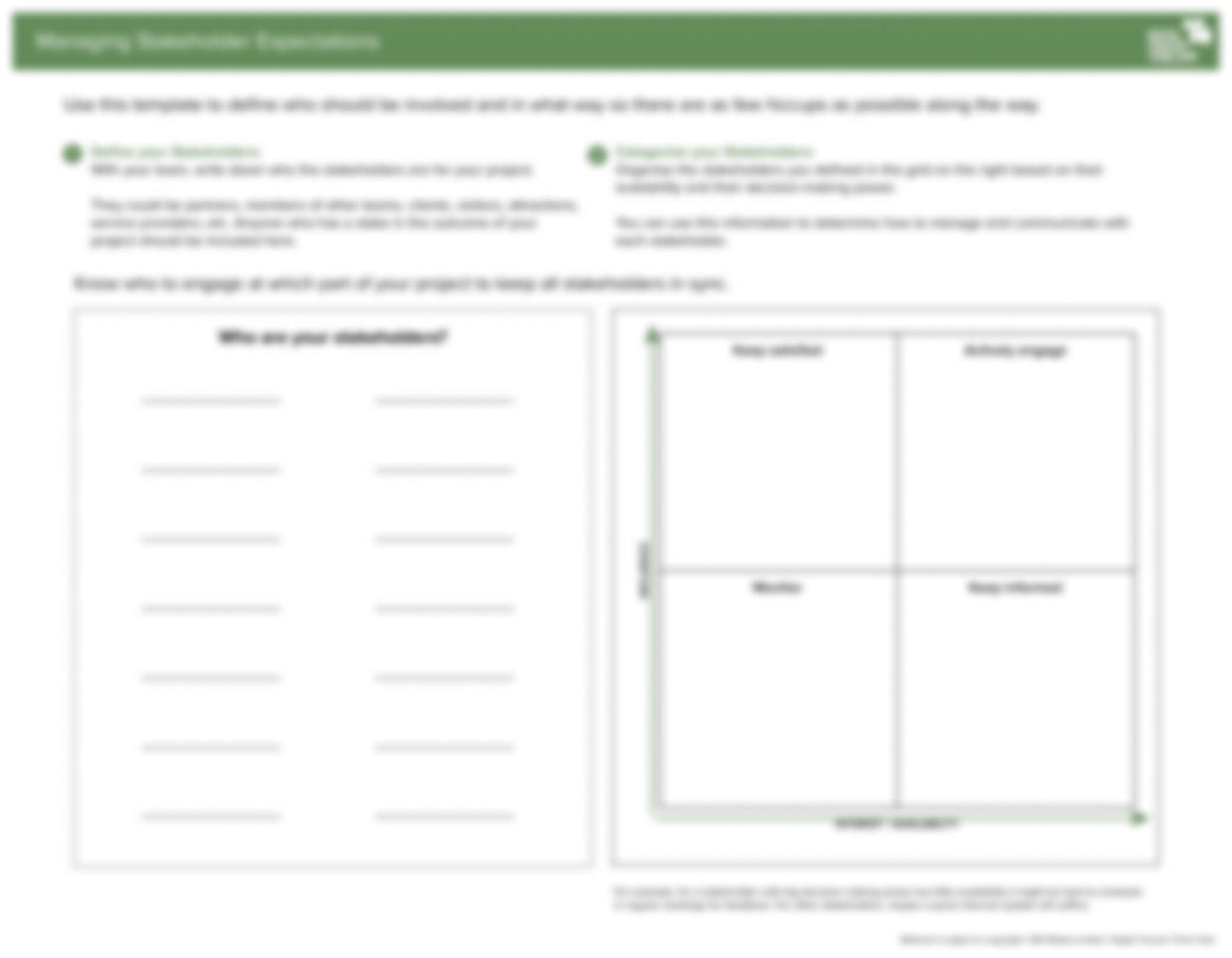 Use this template to define who should be involved in your project and in what way. Learn how to manage your stakeholders' expectations, ranking them according to the fixed parameters of 'influence' and 'interest'.